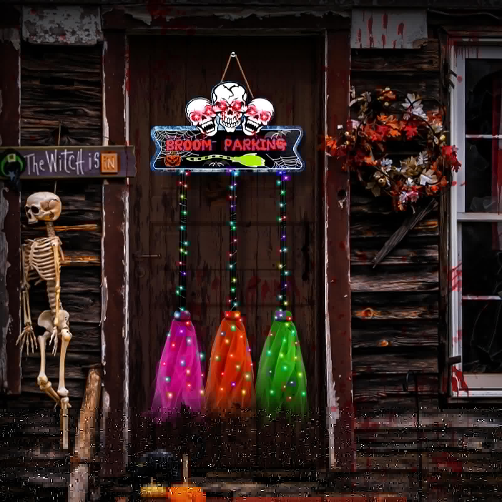 We love how this broom parking sign brings a touch of witch-themed fun to our Halloween decor! The glowing red skull eyes and colorful broom lights really catch the eye. It’s perfect for hanging on our front door or propping up on the porch.